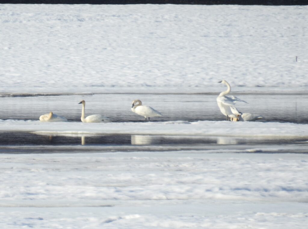 The swans are back and they are so beautiful! Right now the lakes are still frozen so they can’t begin nesting. They found this piece of open water on the Susitna River and landed for a few hours then flew off. Once they start nesting in the lakes we won’t see them on the river any more. I love seeing them while it lasts.